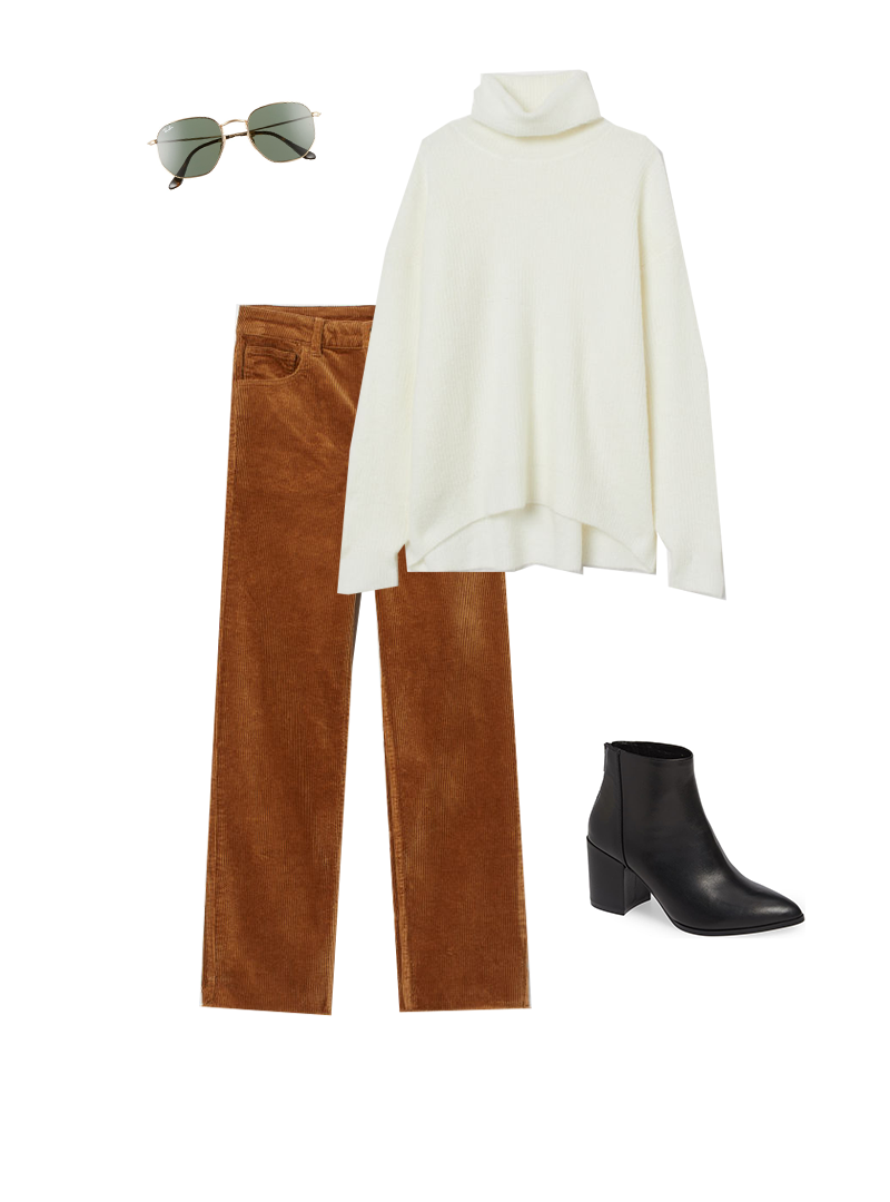 4. Pantalon en velours côtelé + col roulé + bottines noires + lunettes de soleil