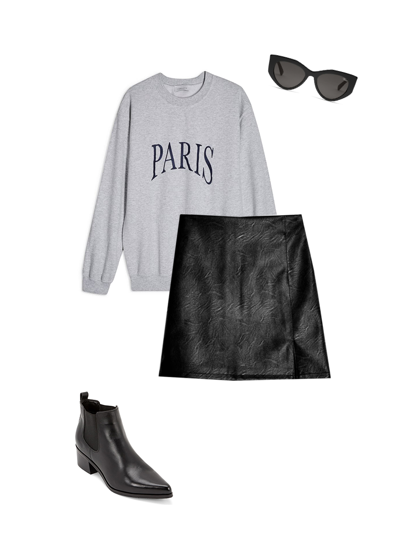 5. Sweat graphique + jupe en cuir + lunettes de soleil œil-de-chat