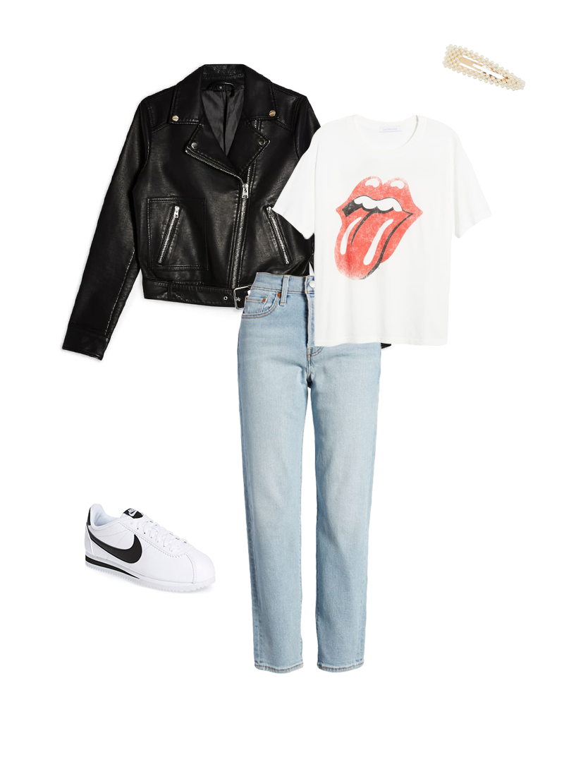 2. Veste en cuir + t-shirt graphique + baskets + pince à perles