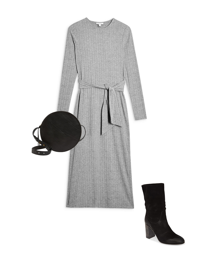 6. Robe à taille nouée + bottes souples + bandoulière ronde