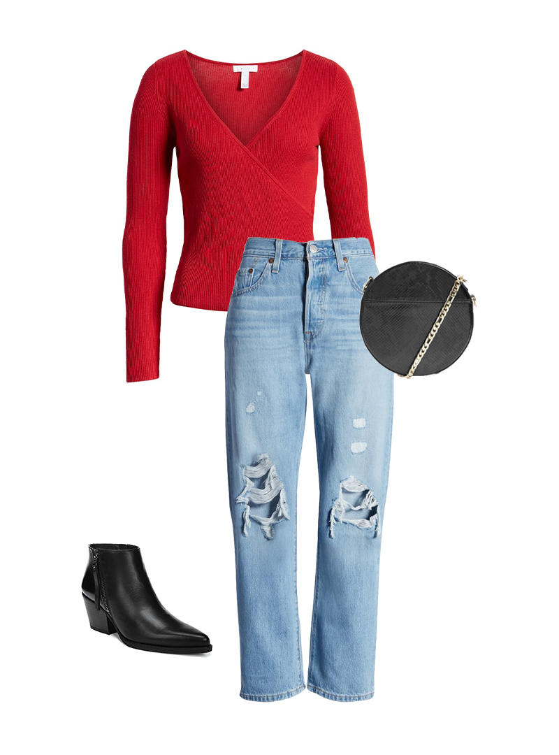 8. Pull cache-cœur + denim déchiré + bottines western + bandoulière ronde