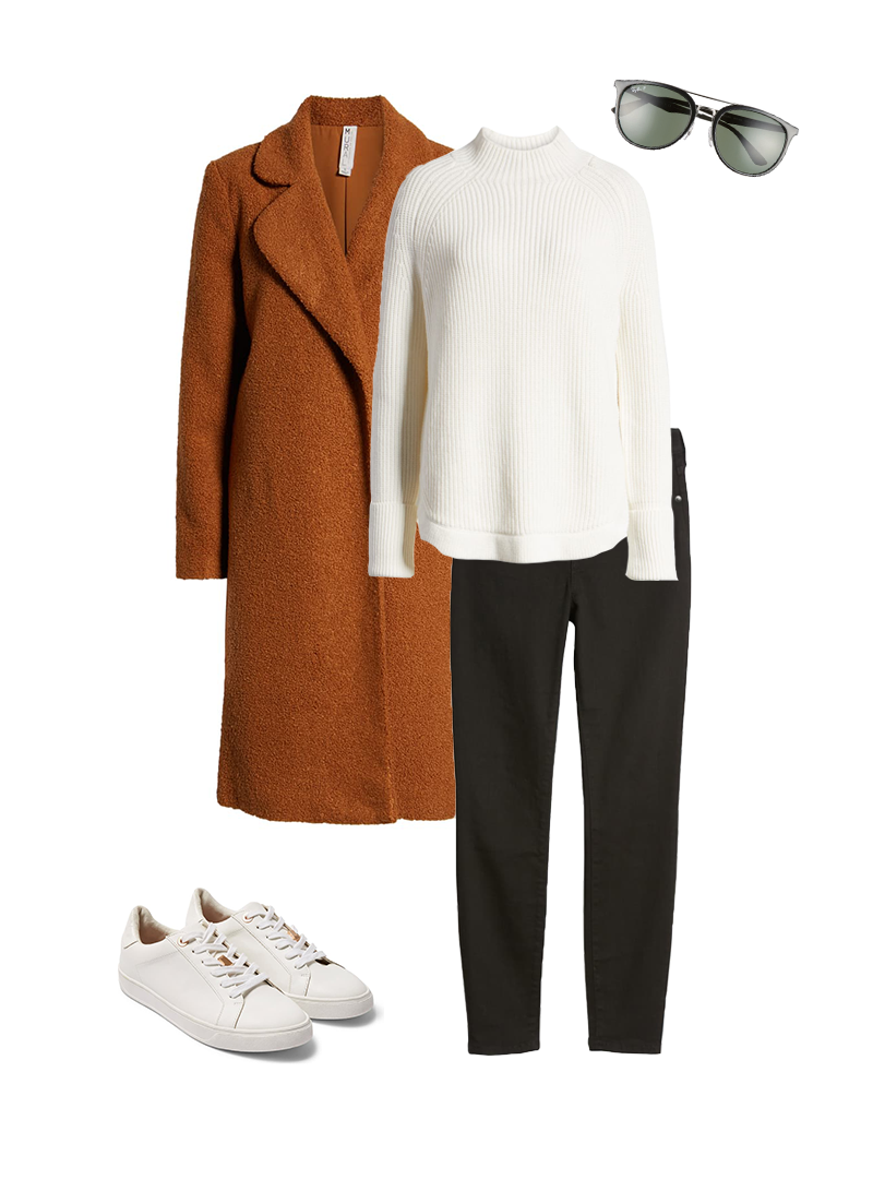 manteau / baskets / jeans / pull-over / des lunettes de soleil