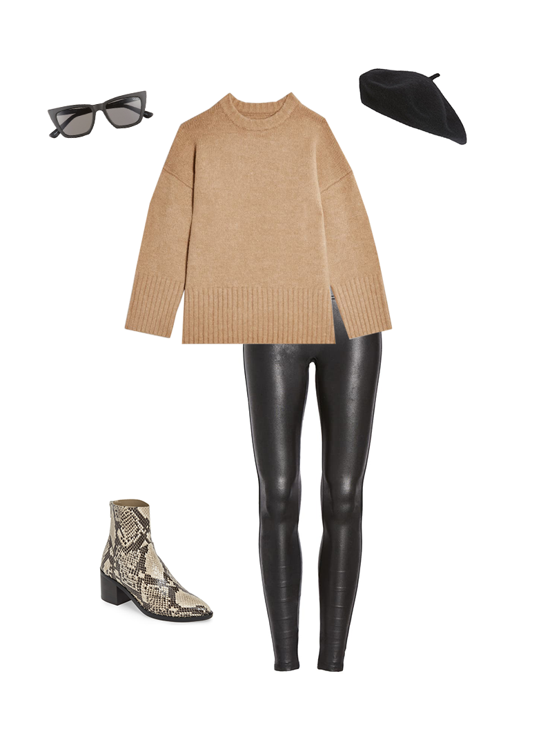 1. Pull camel + leggings en cuir + bottes en peau de serpent
