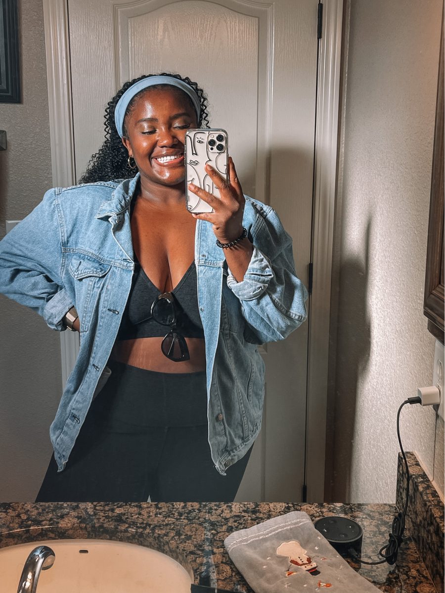 Tout le monde devrait posséder une veste en jean, elle est intemporelle ! Dernièrement, j’aime les porter par-dessus mes vêtements de sport (en particulier un ensemble assorti) avec mes lunettes de soleil pour un look plus « Sporty Spice ». J’aime beaucoup les vêtements de sport entièrement noirs, alors pour donner un peu de couleur à un look comme celui-ci, j’opterais pour des baskets aux couleurs vives. Mon conseil pour acheter la veste en jean parfaite est de prendre une ou deux tailles au-dessus pour un look surdimensionné et une coupe confortable.