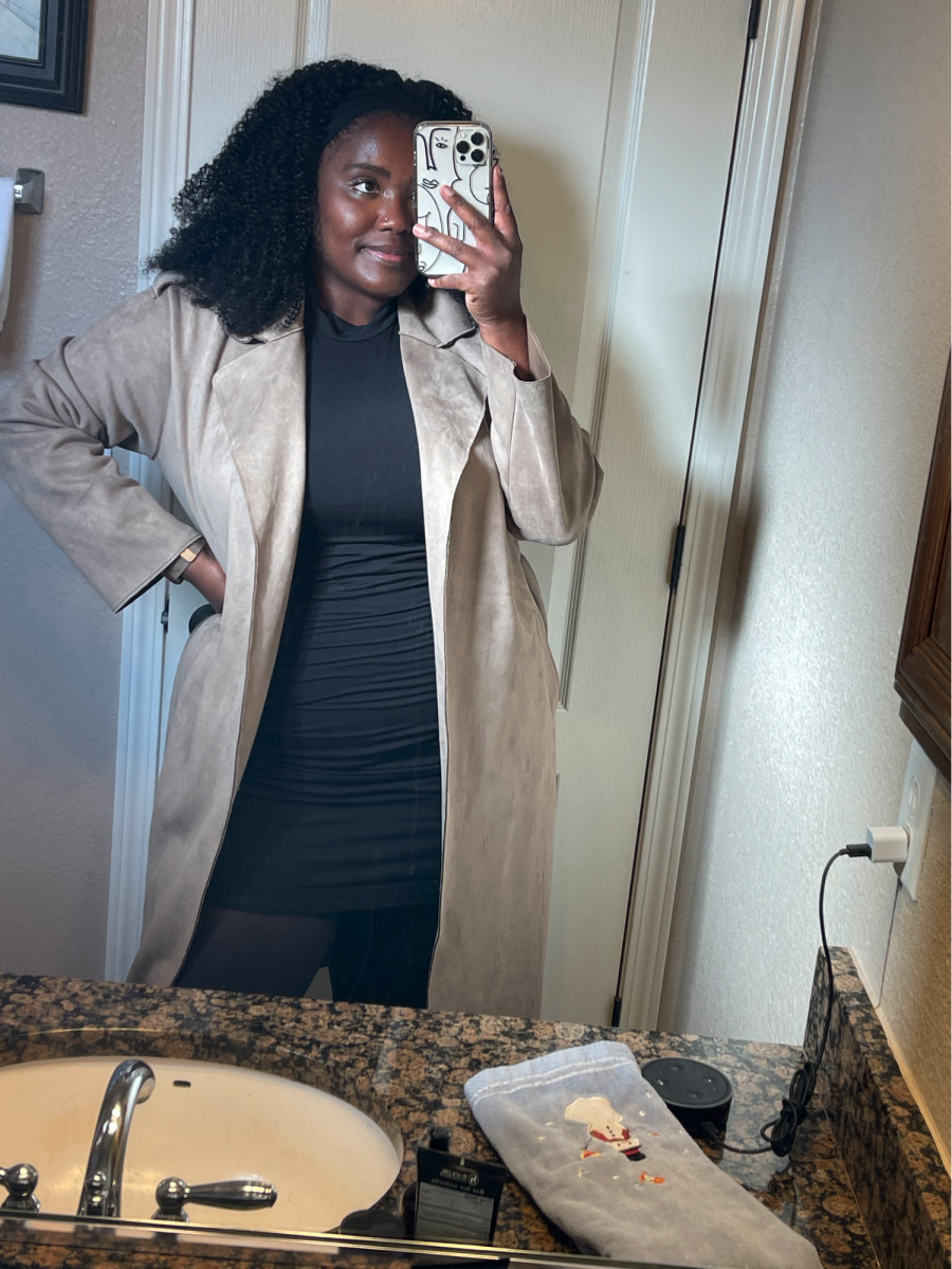 Quoi de mieux qu’un col montant noir ? Une robe moulante noire à col montant. Vous savez ce qui me dérange le plus dans les cols montant, les cols roulés et autres hauts avec de petites ouvertures pour la tête ? La petite ouverture pour la tête – et j’ai une grosse tête avec beaucoup de cheveux ! Cette robe est incroyable car il y a une fermeture éclair dans le dos qui vous permet d’éviter de tacher votre maquillage lorsque vous mettez la robe. Pour un look chaleureux et professionnel, j’aime associer cette robe à des collants opaques, un trench en daim et des bottines noires à talons.