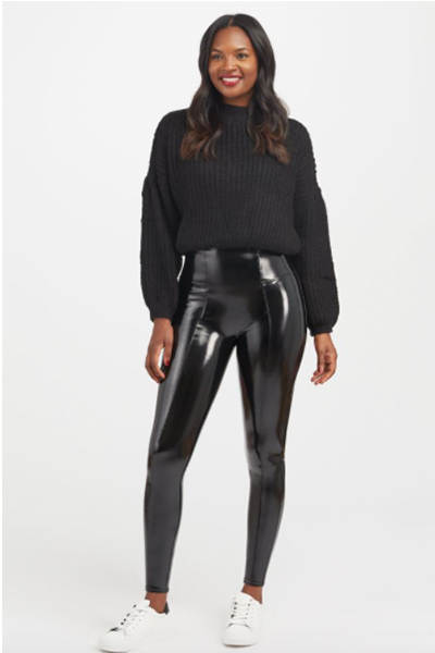Si je devais trouver une plainte à propos des miens, je dirais une seule chose : ils ne sont pas exactement regarder comme le cuir. Ils ressemblent plus à un hybride cuir / legging, ce qui convient parce que c’est exactement ce qu’ils sont, mais une fois dans une lune bleue, je veux ressembler davantage à Olivia Newton John cousue dans un pantalon en cuir aussi serré que le sien. peau que je ne veux avoir l’air de porter des leggings en cuir. Et voilà, l’univers a ressenti cette énergie et m’a offert un cadeau sous la forme d’une publicité ciblée pour le nouveau de Spanx, brevet leggings en cuir.